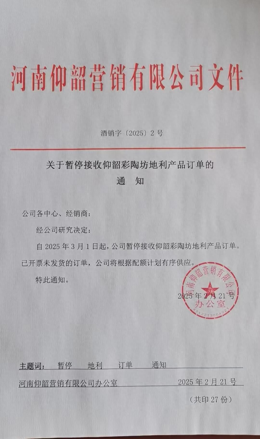 2月21日,河南仰韶营销有限公司发布了一则重要通知。宣布,自3月1日起,暂停接收仰韶彩陶坊地利产品订单;针对已开票未发货的订单,将严格遵循配额计划有序供应,确保市场秩序稳定。